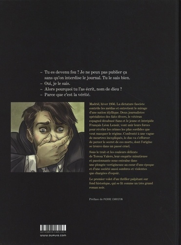 Contrapaso , comme un chant à deux voix : une enquête au long cours, à contretemps, magistralement orchestrée sur près de 150 pages par Teresa Valero. A Madrid, en 1956, à la rédaction de La Capital , tout semble opposer Léon Lenoir, le jeune reporter fougueux qui vient de débarquer de Paris, et Emilio Sanz, un vétéran des faits divers, aguerri aux pratiques de la presse dans cet état policier. Ces deux-là ont en commun ce besoin de vérité chevillé au corps et les quatre vertus désignées par Camus qui permettent au journaliste de rester libre même en dictature : la lucidité, le refus, l'ironie et l'obstination. Aidé par la charmante Paloma Rios, illustratrice, le duo remonte la piste d'un meurtre pour découvrir le sort des femmes victimes de la dictature au lendemain de la guerre civile. Avec son suspense et ses rebondissements de grand spectacle, le polar perce surtout le mystère des théories racistes et déterministes de l'idéologie fasciste, en mémoire des crimes de la dictature, dans la perspective de l'héritage.