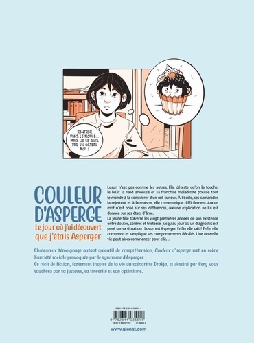 Comment vivre avec ses différences quand personne ne sait les expliquer ? Lusun n'est pas comme les autres. Elle déteste qu'on la touche, regarder les gens dans les yeux lui fait peur, le bruit la rend anxieuse et sa franchise maladroite pousse le monde à la considérer d'un oeil curieux... A l'école, tout le monde la rejette et à la maison, elle communique difficilement... Petit à petit, des idées noires s'immiscent dans son esprit : elle ne correspond pas à la norme et c'est un mal dont elle est la seule responsable. Aucun mot n'est posé sur ses différences, aucune explication ne lui est donnée sur ses états d'âmes... Pour apprendre à comprendre qui elle est vraiment, devenir autonome et s'accepter, Lusun traverse les vingt premières années de son existence entre doutes, colères et tristesse. Parfois pourtant, elle accède à quelques moments de répits, des petits instants de joie offerts par sa famille, son meilleur ami Jérôme Bouton et son obsession pour le rubik's cube. Elle reste toutefois instable jusqu'au jour où un diagnostic est posé sur sa situation : Lusun est Asperger. Enfin elle sait ! Enfin elle comprend ! Enfin ! Elle s'explique ses comportements décalés. Enfin ! Lusun peut être correctement accompagnée. Une nouvelle vie peut commencer. Témoignage autant qu'outil de compréhension Couleur d'asperge met en scène l'anxiété sociale provoquée par le syndrome d'Asperger. Cela dit, au fil de la lecture, il devient clair que le mal-être des personnes touchées par cette forme d'autisme n'est pas tant lié à ses symptômes qu'à un manque d'accompagnement et de compréhension. Drakja au scénario et Gery au dessin livrent dans les pages de leur première bande dessinée, un récit de fiction juste et réaliste inspiré de leurs vécus et parsemé d'histoires personnelles. Un roman graphique touchant, optimiste et chaleureux.