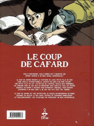 Quels stratagèmes, duels mondes doit s'inventer une enfant soumise à un abus sexuel intrafamilial ? Le coup de cafard raconte le quotidien de Lucia, petite fille au sein d'une famille dysfonctionnelle, soumise aux abus d'un père violent. Une petite fille qui est l'alter ego de l'autrice, Cecilia Gato Fernandez, qui témoigne ainsi de son vécu en racontant avec subtilité tous les moyens auxquels un enfant a recours pour affronter l'indicible, pour essayer d'échapper a un abus dont il ne sait pas qu'il n'est pas "normal".