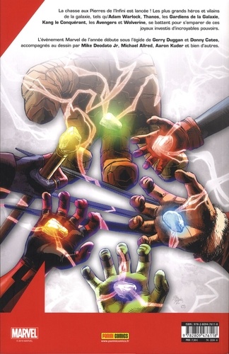 La chasse aux Pierres de l'Infini est lancée ! Les plus grands héros et vilains de la galaxie, tels qu'Adam Warlock, Thanos, les Gardiens de la Galaxie, Kang le Conquérant, les Avengers et Wolverine, se battent pour s'emparer de ces joyaux investis d'incroyables pouvoirs. L'événement Marvel de l'année débute sous l'égide de Gerry Duggan et Danny Cates, accompagnés au dessin par Mike Deodato Jr, Michael Allred, Aaron Kuder et bien d'autres.