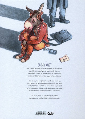 Qui es-tu Mulo ? Un bâtard, fruit de l'union d'un âne et d'une jument, ayant l'habitude d'ignorer les regards chargés de mépris. Quand on grandit dans un orphelinat, on apprend à encaisser les coups et les railleries. Qui es-tu, Mulo ? Ignorant tout de ses origines, il n'a jamais pu répondre à cette question. Une lettre anonyme arrive pourtant un beau matin et prétend qu'il trouvera des éléments de réponse dans le casier d'une ancienne conserverie située sur une île. Qui es-tu, Mulo ? Le héros têtu et tenace de ce polar animalier. Une vraie tête de mule.