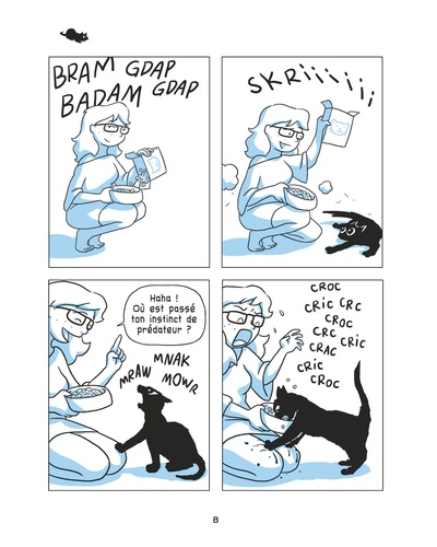 Crapule est un petit chat noir, tout maigre, avec des yeux globuleux. Dans son appartement vit aussi une jeune humaine en quête d'amour qui semble de moins en moins pressée de remplir sa gamelle et de changer sa litière. Ensemble, ils vont vivre de précieux petits moments d'incompréhension et de jalousie.