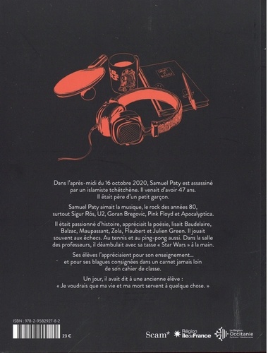 Dans l'après-midi du 16 octobre 2020, Samuel Paty est assassiné par un islamiste tchétchène. Il venait d'avoir 47 ans. Il était père d'un petit garçon. Samuel Paty aimait la musique, le rock des années 80, surtout Sigur Rós, U2, Goran Bregovic, Pink Floyd et Apocalyptica. Il était passionné d'histoire, appréciait la poésie, lisait Baudelaire, Balzac, Maupassant, Zola, Flaubert et Julien Green. Il jouait souvent aux échecs. Au tennis et au ping-pong aussi. Dans la salle des professeurs, il déambulait avec sa tasse "Star Wars" à la main. Ses élèves l'appréciaient pour son enseignement... et pour ses blagues consignées dans un carnet jamais loin de son cahier de classe. Un jour, il avait dit à une ancienne élève : "Je voudrais que ma vie et ma mort servent à quelque chose". Valérie Igounet est historienne, journaliste et directrice adjointe de l'Observatoire du conspirationnisme. Ses recherches se situent au croisement de l'histoire politique et de l'histoire des idées. Spécialiste du négationnisme, du complotisme et de l'extrême droite en France après 1945, elle a publié plusieurs ouvrages sur ces sujets. Guy Le Besnerais dessine depuis l'enfance, expérimente la BD aux Ateliers des Beaux-Arts de Paris et rejoint l'association BD54. Après une carrière d'ingénieur de recherches, il décide de se consacrer à l'illustration en 2021. Crayon noir est son premier roman graphique. Coloriste BD depuis plusieurs années, Mathilda a notamment réalisé la mise en couleurs des Algues vertes (Delcourt, 2019) et de Flic (Goutte d'Or, 2021).