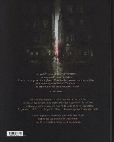 Fresque en 3 tomes, cette adaptation initiée par Jean Teulé fait la part belle à l'image et l'imaginaire. En trois volumes, elle s'attarde sur les grandes périodes de la vie de Baudelaire et enlumine de peintures expressionnistes les grands poèmes qui jalonnent le récit. Teulé montre un homme qui travaillait ses vers sans relâche, qui voulait réunir dans une même musique l'ignoble et le sublime, et qui a changé à jamais, avec les Fleurs du Mal, la poésie française. Dans ce troisième tome, la parution des Fleurs du Mal est un scandale sans précédent. Etrillé par la presse, moqué par les caricaturistes, Charles Baudelaire et ses éditeurs sont condamnés à de lourdes amendes (lui qui n'a pas un sou), et sont déchus de leurs droits civiques. Plus grave encore, il faut retirer six poèmes du recueil, soit arracher sur les exemplaires existants, les pages correspondantes, mutilant l'ouvrage et enlevant au passage d'autres poèmes... Le soutien de certains de ses pairs, dont Victor Hugo, ainsi que l'adulation qu'il commence à recevoir de jeunes fans, le laissent de marbre. Sa situation financière n'a jamais été aussi délicate et la maladie de Jeanne empire brusquement. Il faut trouver de l'argent. Il saisit une proposition de conférences venant de Bruxelles... sa découverte du pays et de ses habitants va laisser une trace profonde...