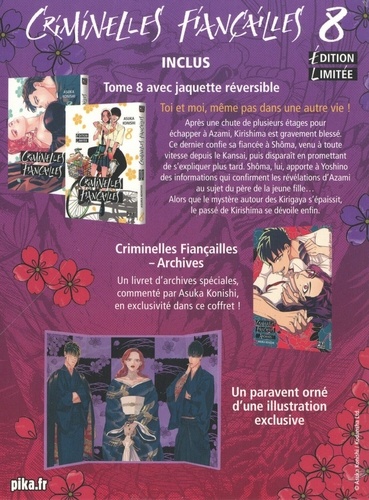 Toi et moi, même pas dans une autre vie ! Après une chute de plusieurs étages pour échapper à Azami, Kirishima est gravement blessé. Ce dernier confie sa fiancée à Shôma, venu à toute vitesse depuis le Kansai, puis disparaît en promettant de s'expliquer plus tard. Shôma, lui, apporte à Yoshino des informations qui confirment les révélations d'Azami au sujet du père de la jeune fille... Alors que le mystère autour des Kirigaya s'épaissit, le passé de Kirishima se dévoile enfin. Criminelles Fiançailles - Archives. Un livret d'archives spéciales, commenté par Asuka Konishi, en exclusivité dans ce coffret !