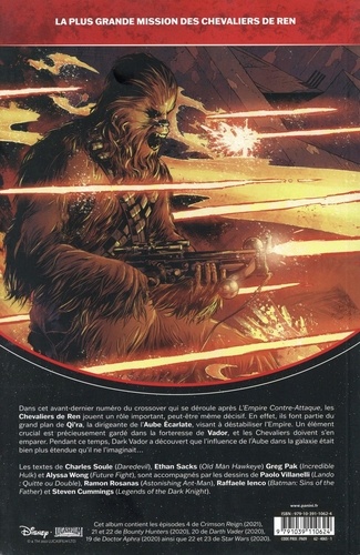 Dans cet avant-dernier numéro du crossover qui se déroule après L'Empire Contre-Attaque, les-- Chevaliers de Ren jouent un rôle important, peut-litre même décisif. En effet, ils font-partie du grand plan de QI'ra, la dirigeante de l'Aube Ecarlate, visant a déstabiliser l'Empire. Un élément crucial est précieusement gardé dans la forteresse de Vador, et les Chevaliers doivent s'en emparer. Pendant ce temps, Dark Vador a découvert que l'influence de l'Aube dans la galaxie était bien plus étendue qu'il ne l'imaginait... Les textes de Charles Soule (Daredevil), Ethan Sacks (Old Man Hawkeye) Greg Pak (Incredible Hulk) et Alyssa Wong (Future Fightl), sont accompagnés par les dessins de Paolo Villanetli (Lando : Quitte ou Double), Ramon Resanas (Astonishing Ant-Man), Raffaele lenco (Batman : Sins Of the Father) et Steven Cummings (Legends of the Dark Knight).