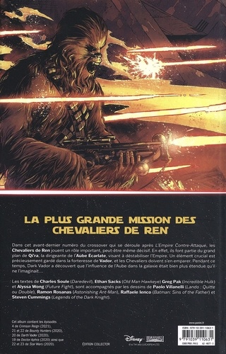 Dans cet avant-dernier numéro du crossover qui se déroule après L'Empire Contre-Attaque, les Chevaliers de Ren jouent un rôle important peut-être même décisif. En effet, ils font partie du grand plan de Qi'ra ; .la dirigeante de l'Aube Ecarlate, visant a déstabiliser l'Empire : Un élément crucial est précieusement gardé dans la forteresse de Vador, et les Chevaliers doivent s'en emparer. Pendant ce temps, Dark Vador a découvert que l'influence de l'Aube dans la galaxie était bien plus étendue qu'il ne l'imaginait... Les textes de Charles Soule (Daredevil), Ethan Sacks (Old Man Hawkeye) Greg Pak (Incredible Hulk) et Alyssa Wong (Future Fight), sont accompagnes parles dessins de Paolo Villanelli (Lando Quitté ou Double), Ramon Rosanas (Astonishing Ant-Man), Raffaele lenco (Batman : Sins of the Father) et Steven Cummings (Legends of the Dark Knight).