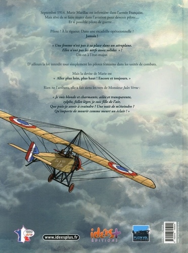 Septembre 1914. Marie Marillac est infirmière dans l'armée française, mais rêve de se faire muter dans l'aviation pour devenir pilote... Et si possible pilote de guerre... Pilote ? A la rigueur. Dans une escadrille opérationnelle ? Jamais ! "Une femme n'est pas à sa place dans un aéroplane. Elles n'ont pas les nerfs assez solides ! " Dit-on à l'état-major. D'ailleurs la loi interdit tout simplement les pilotes féminins dans les unités de combats. Mais la devise de Marie est : "Aller plus loin, plus haut ! Encore et toujours." Rien ne l'arrêtera, elle a fait siens ces vers de Monsieur Jules Vernes : "Je suis blonde et charmante, ailée et transparente, sylphe, follet léger, je suis fille de l'air, que puis-je avoir à craindre ? Une nuit de m'éteindre ? Qu'importe de mourir comme meurt un éclair ! "