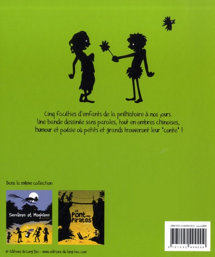 Cinq facéties d’enfants de la préhistoire à nos jours. Une bande dessinée sans paroles, tout en ombres chinoises, humour et poésie où petits et grands trouveront leur «conte» !