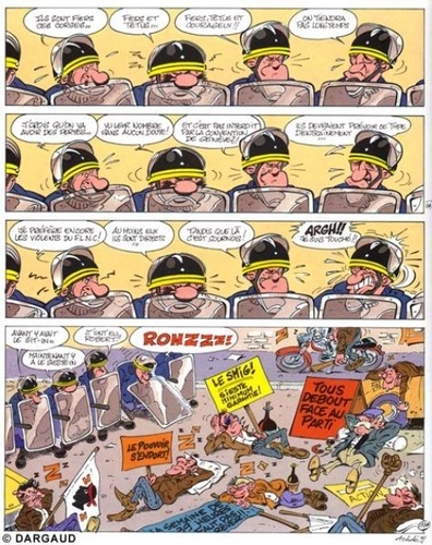 Un CRS héros de BD, c'est une grande première. Eugène Lacrymo a 25 ans de métier, c'est-à-dire qu'entre autres castagnes glorieuses, il a fait 68 et en conçoit une certaine nostalgie. Au moins, les choses étaient claires : il y avait les gauchistes et les anars. Maintenant, le panel s'est élargi. Remarquez, ça lui permet de faire des comparaisons : par exemple, sur le plan coriacité, les métallurgistes ne valent pas les sidérurgistes lorrains. Mai 68, ce n'est pas seulement les manifs, c'est son mariage avec Simone - 25 ans de fidélité - et la conception, entre deux barricades, d'un fiston baptisé Gédéon. Eugène Lacrymo aime son métier. Il lui arrive de courser les manifestants jusque sur leur lit d'hôpital, et s'il donne une carte de séjour à un immigré, ce n'est que dans un cauchemar dû à l'abus de chipolatas. Le reste du temps, il empile les bavures. Une parodie complètement délirante qui fera plaisir à tous ceux qui ont un jour assisté à une manif - de près, de plus loin, ou à la télé...