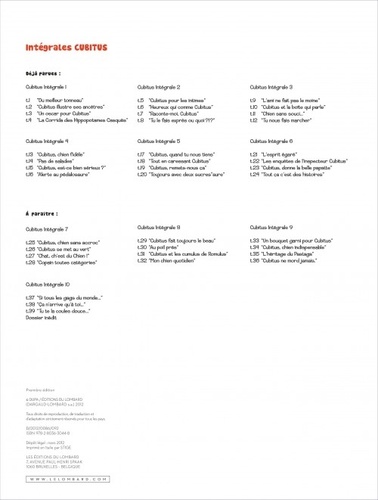 Ce n'est pas parce que Bidule est à l'honneur dans les pages nouveautés que l'on doit pour autant oublier son illustre parent, le débonnaire et volubile Cubitus ! Le Lombard poursuit la réédition intégrale de l'œuvre majeure de Dupa. À l'instar de son maître et ami, Greg, l'auteur de Cubitus possédait ce don du gag en une page, porté aussi bien par un dynamisme visuel de tous les instants que par une verve jamais tarie.