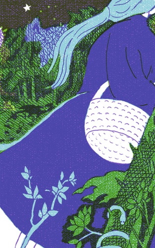 Dans une forêt remplie de petites créatures, une femme cueille et ramasse des champignons et autres plantes sauvages, dans le but d'élaborer un breuvage mystérieux. Avec leporello en 12 volets, intégralement imprimé (en sérigraphie) et façonné à la main, Line Hachem nous offre et dessine, avec un jeu subtil de trames profondes, une récolte et une cuisine aux allures fantastiques, suspecte, fumeuse. Mais qu'arrivera-t-il donc aux buveurs de cet étrange bouillon...