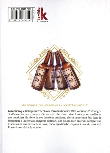 La relation que Dahliya entretient avec son ami chevalier, Wolf continue d'interroger et d'alimenter les rumeurs. Cependant, elle reste prête à tout pour améliorer son quotidien. Et, forte de ses dernières créations elle se lance cette fois dans la fabrication d'un réchaud magique compact. Elle pourra bien entendu compter sur le soutien de son dévoué bras droit, Ivano, qui cherche toujours à faire de la société Rossetti une véritable réussite.