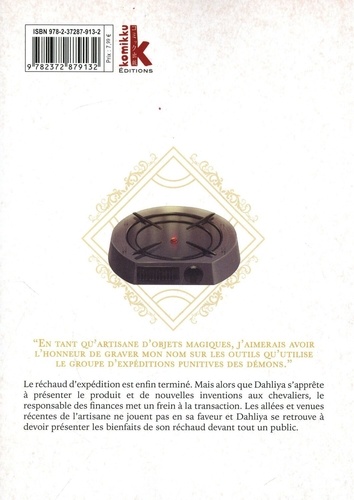 Dahliya va vous ensorceler ! "EN TANT QU'ARTISANE D'OBJETS MAGIQUES, J'AIMERAIS AVOIR L'HONNEUR DE GRAVER MON NOM SUR LES OUTILS QU'UTILISE LE GROUPE D'EXPEDITIONS PUNITIVES DES DEMONS". Le réchaud d'expédition est enfin terminé. Mais alors que Dahliya s'apprête à présenter le produit et de nouvelles inventions aux chevaliers, le responsable des finances met un frein à la transaction. Les allées et venues récentes de l'artisane ne jouent pas en sa faveur et Dahliya se retrouve à devoir présenter les bienfaits de son réchaud devant tout un public.