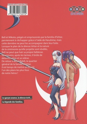 Bell et Mikoto, piégés et emprisonnés parla familia d'Ishtar, parviennent à s'échapper grâce à l'aide de Haruhime, mais cette dernière ne peut les accompagner dans leur fuite. Lorsque le plan de la déesse Ishtar et la nature de la cérémonie qu'elle projette sont révélés, Bell ne peut que haïr sa propre faiblesse. Néanmoins, après les larmes, il brûle de détermination et se relève. De retour à Belet Babili, le quartier général de la familia d'Ishtar, il est temps de mettre en branle l'un plans les plus fous de notre héros ! Le garçon avance, la déesse écrit... La légende des familias.