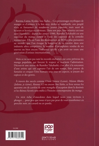 Ranma, Lamu, Kyoko, Inu-Yasha... Ces personnages mythiques de mangas et d'animes, à la fois sexy, drôles et combatifs, ont peuplé rêves et fantasmes de nombreux jeunes Japonais, mais aussi de lecteurs et lectrices occidentaux. Dans son pays, leur créatrice est tout aussi légendaire : depuis les années 1980, Rumiko Takahashi est une superstar du manga shonen et l'une des papesses de la comédie romantique. Elle est l'une des dessinatrices de BD les plus puissantes au monde, que l'on évoque la longévité de sa carrière dans une industrie ultra compétitive, le nombre d'exemplaires vendus de ses oeuvres ou bien encore l'influence qu'elle a pu avoir sur toute une génération d'artistes internationaux. Mais ce ne sont pas tant les records enchaînés par cette prêtresse du manga populaire qui forcent le respect et suscitent l'admiration. Découvrir une oeuvre de Rumiko Takahashi, c'est aller à la rencontre d'une artiste qui sait capturer l'air de son temps, faire preuve de fantaisie et croquer l'être humain sous tous ses aspects, se jouant des espèces et des genres. A travers des succès comme Urusei Yatsura (Lamu), Maison Ikkoku (Juliette, je t'aime), Ranma 1/2 ou encore Inu-Yasha, ce livre retrace les quarante ans de carrière de cette mangaka d'exception dont la destinée et les thèmes favoris sont mêlés à l'histoire contemporaine du manga. Un récit riche d'anecdotes dans lequel nous vous invitons à plonger... pour peu que nous n'ayez pas peur de vous transformer en porcelet noir, en canard ou en panda.