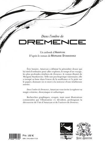 Etre lunaire, Amaryan a délaissé la pénombre douce qui lui sied d'ordinaire pour aller explorer, le temps d'un voyage, les plus profondes ténèbres de Dremence, le roman illustré de Morgane Stankiewiez. Telle une psychopompe visionnaire, elle a trempé sa lame dans l'encre de la souffrance et l'a jetée sur le papier, donnant vie et mort à la noirceur d'une ténébreuse autrice. Dans l'ombre de Dremence, Amaryan vous invite à explorer sa magie créatrice, dionysiaque et cathartique. Recherches graphiques, croquis, mais aussi illustrations commentées par l'illustratrice s'y dévoilent, prolongeant la découverte de l'Art d'Amaryan et de l'univers de Dremence.