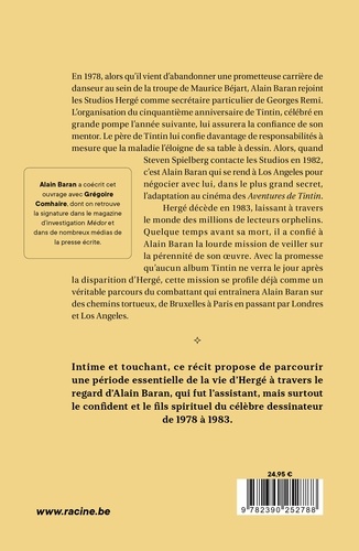 Plus de 40 ans après le décès du célèbre dessinateur, son dernier secrétaire, confident d'Hergé, dévoile les coulisses des dernières productions : les conditions de réalisation de l'Alph-Art, les négociations avec Steven Spielberg, les conséquences du décès d'Hergé, l'arrivée de Nick Rodwell... En 1978, Alain Baran rejoint les Studios Hergé comme secrétaire particulier du déjà célèbre Georges Remi. Le 50e anniversaire de Tintin, célébré en grande pompe l'année suivante, vont petit à petit l'amener à gagner la confiance de son mentor. Le père de Tintin lui confie davantage de responsabilités à mesure que la maladie l'éloigne de sa table à dessin. Alors quand Steven Spielberg contacte les studios en 1982, c'est Alain Baran qui se rend à Los Angeles pour le rencontrer. Hergé décède brutalement en 1983, laissant des millions de lecteurs orphelins à travers le monde. Quelques jours avant son décès, il a confié à Alain Baran la lourde mission de veiller sur la pérennité de son oeuvre. Avec la promesse qu'aucun album de Tintin ne pourra voir le jour après sa mort, cette mission se profile déjà comme un véritable parcours du combattant qui entraînera Alain Baran sur des chemins tortueux, de Bruxelles à Paris, en passant par Londres et Los Angeles.