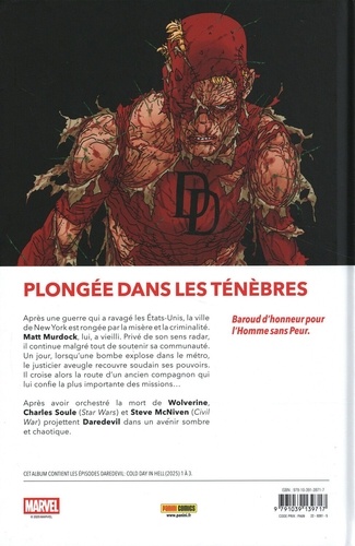 L'avenir ne s'annonce pas radieux... Matt Murdock a vieilli, ses pouvoirs l'abandonnent peu à peu. Incapable de défendre les rues de New York en tant que Daredevil, il consacre désormais ses forces à aider les plus démunis à la soupe populaire. Jusqu'au jour où un événement tragique à Hell's Kitchen va tout changer... Charles Soule et Steve McNiven, les auteurs qui ont signé La mort de Wolverine, se retrouvent pour imaginer un futur sombre pour l'Homme Sans Peur. Entre Spider-Man : L'Empire et The Dark Knight Returns, ce récit s'annonce comme le nouveau chef-d'oeuvre du dessinateur d'Old Man Logan et Civil War.
