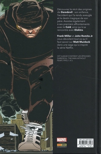 Suite à un accident qui lui a coûté la vue, l'étudiant en droit Matt Murdock est doté de pouvoirs qu'il a l'intention de mettre à profit pour faire le bien. Découvrez comment Matt Murdock devient Daredevil. Un chef-d'oeuvre signé Frank Miller et John Romita Jr. Les origines de Daredevil par le scénariste qui a le plus influencé l'histoire du héros : Frank Miller (Elektra renaît à la vie, Daredevil : Renaissance). Il est accompagné par l'un des dessinateurs les plus importants de l'histoire de Marvel : John Romita Jr (Avengers vs X-Men, Iron Man).