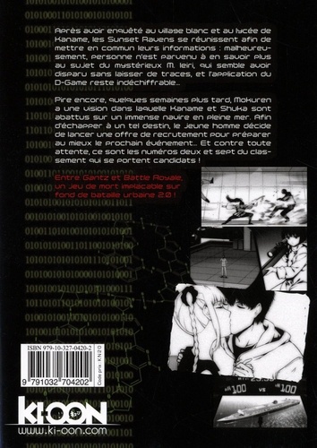 Un thriller social décapant sur fond de bataille urbaine 2. 0 ! Après avoir enquêté au village blanc et au lycée de Kaname, les Sunset Ravens se réunissent afin de mettre en commun leurs informations : malheureusement, personne n'est parvenu à en savoir plus au sujet du mystérieux M. Ieiri, qui semble avoir disparu sans laisser de traces, et l'application du D-Game reste indéchiffrable... Pire encore, quelques semaines plus tard, Mokuren a une vision dans laquelle Kaname et Shuka sont abattus sur un immense navire en pleine mer. Afin d'échapper à un tel destin, le jeune homme décide de lancer une offre de recrutement pour préparer au mieux le prochain événement... Et contre toute attente, ce sont les numéros deux et sept du classement qui se portent candidats !