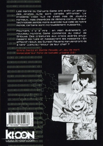 Les marins du Darwin's Game ont enfin un aperçu des pirates qu'ils sont censés affronter. Le problème, c'est qu'il ne s'agit pas de joueurs normaux... mais d'espèces de démons cornus ! Si leur technologie semble moins avancée que celle de notre monde, certains sont incroyablement puissants... Pourtant, il y a pire : en plein événement, un nouveau Hunting Game commence au coeur de Shibuya. Des créatures aux crocs acérés envahissent les rues et massacrent les passants ! En effectif réduit, les Sunset Ravens parviendront-ils à tenir jusqu'au retour de leur chef ?