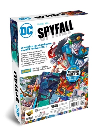 Le célèbre jeu d'ambiance envahit l'univers DC ! Le Joker pourrait se cacher n'importe où et c'est à vous de le débusquer. DC Spyfall inclut 20 Lieux iconiques tel que la Batcave, le Daily Planet et la Forteresse de Solitude. Saurez-vous le retrouver avant qu'il ne soit trop tard ? Contenu : 196 cartes, 24 sachets, 1 Livret de Briefing de Mission. Inclus de nouveaux modes de jeu et des cartes capacités !