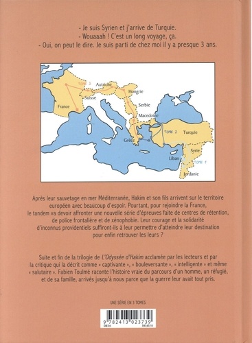 - Je suis Syrien et j'arrive de Turquie. - Wouaaah ! C'est un long voyage, ça. - Oui, on peut le dire. Je suis parti de chez moi il y a presque 3 ans... Après leur sauvetage en mer Méditerranée, Hakim et son fils arrivent sur le territoire européen avec beaucoup d'espoir. Pourtant, pour rejoindre la France, le tandem va devoir affronter une nouvelle série d'épreuves faite de centres de rétention, de police frontalière et de xénophobie. Leur courage et la solidarité d'inconnus providentiels suffiront-ils à leur permettre d'atteindre leur destination pour enfin retrouver les leurs ? Suite et fin de la trilogie de L'Odyssée d'Hakim acclamée par les lecteurs et par la critique qui la décrit comme captivante", "bouleversante", "intelligente" et même "salutaire". Fabien Toulmé raconte l'histoire vraie du parcours d'un homme, un réfugié, et de sa famille, arrivés jusqu'à nous parce que la guerre leur avait tout pris. Une série lauréate du Prix Franceinfo de la Bande Dessinée d'Actualité et de Reportage".