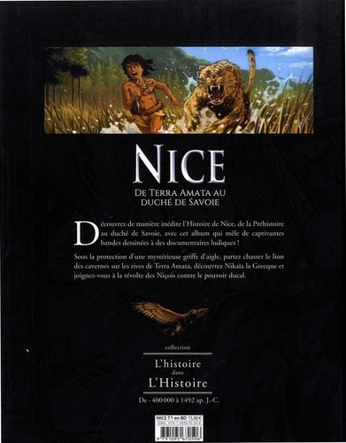 Découvrez de manière inédite l'Histoire de Nice, de la Préhistoire au duché de Savoie, avec cet album qui mêle de captivantes bandes dessinées à des documentaires ludiques ! Sous la protection d'une mystérieuse griffe d'aigle, partez chasser le lion des cavernes sur les rives de Terra Amata, découvrez Nikaïa la Grecque et joignez-vous à la révolte des Niçois contre le pouvoir ducal.
