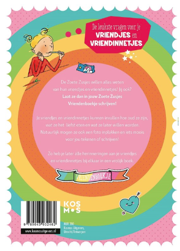 Dit is hét vriendenboekje van de Zoete Zusjes! Een album voor de mooiste herinneringen aan klasgenoten en vrienden. In dit vriendenboek kunnen je klasgenoten, vrienden, familie en sportmaatjes een heleboel grappige weetjes over zichzelf vertellen. Daarna kunnen ze met stiften en kleurpotloden aan de slag om de kleurplaat om te toveren tot een pareltje. Bovendien is er plaats voor een foto: leuk voor later! De kleurplaten en de meerkeuzevragen maken dit vriendenboek net anders dan de rest. Creëer een album vol leuke herinneringen. Dit vriendenboek is ook leuk om cadeau te geven of te krijgen. Ter gelegenheid van een verjaardag, diploma, Sinterklaas, Kerstmis of gewoon zomaar.