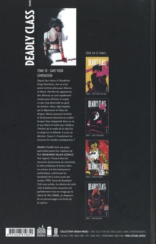 Depuis leur retour à l'Académie Kings Dominion, rien ne s'est passé comme prévu pour Marcus et Maria. Derrière les apparences, des alliances se sont rapidement nouées pour éliminer le couple, un peu trop désinvolte au goût de certains. Alors, déjà fragilisé par la dépression et l'abus de drogue, Marcus poursuit sa lente et douloureuse descente aux enfers lorsque Saya réapparaît dans sa vie et que Maria le trahit pour Stefano, l'héritier de la mafia de la côte Est. Le doigt sur la détente, il a pris sa décision. Saura-t-il seulement en assumer les lourdes conséquences ? Deadly class tient une place particulière parmi les créations de Rick Remender (Black Science, Fear Agent). Puisant dans les souvenirs de jeunesse du scénariste, la série embarque le lecteur dans un univers à la fois fantasmé et authentique, rythmé par les standards de la scène punk des années 1990. Sorte de Breakfast Club sous acides, la violence de cette virée d'adolescents assassins est parfaitement mise en image par le talent de Wes Craig, au diapason de ces personnages à la limite de la rupture.