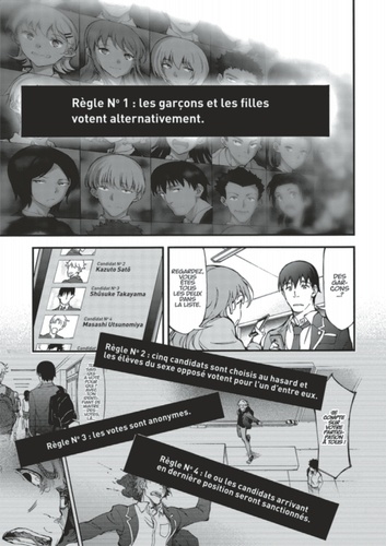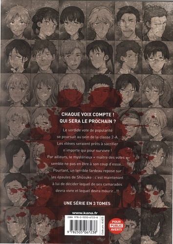 Chaque voix compte ! Qui sera le prochain ? Le sordide vote de popularité se poursuit au sein de la classe 2-A. Les élèves seraient prêts à sacrifier n'importe qui pour survivre ! Par ailleurs, le mystérieux "maître des votes" semble ne pas en être à son coup d'essai... Pourtant, un terrible fardeau repose sur les épaules de Shûsuke : c'est maintenant à lui de décider lequel de ses camarades devra vivre et lequel devra mourir...!