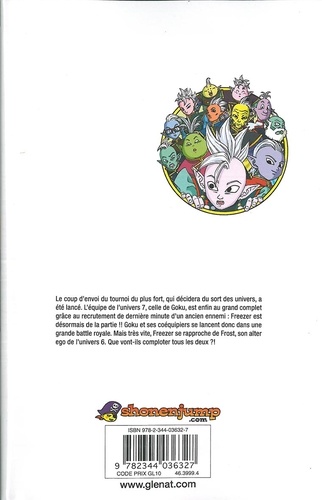 Le coup d'envoi du tournoi du plus fort, qui décidera du sort des univers, a été lancé. L'équipe de l'univers 7, celle de Goku, est enfin au grand complet grâce au recrutement de dernière minute d'un ancien ennemi : Freezer est désormais de la partie !! Goku et ses coéquipiers se lancent donc dans une grande battle royale. Mais très vite, Freezer se rapproche de Frost, son alter-ego de l'univers 6. Que vont-ils comploter tous les deux ? !