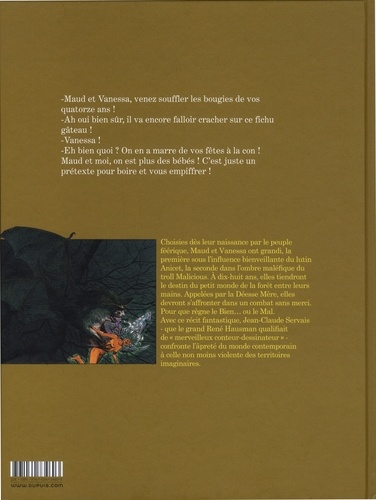 Choisies dès leur naissance par le peuple féérique, Maud et Vanessa ont grandi, la première sous l'influence bienveillante du lutin Anicet, la seconde dans l'ombre maléfique du troll Malicious. A dix-huit ans, elles tiendront le destin du petit monde de la forêt entre leurs mains. Appelées par la Déesse Mère, elles devront s'affronter dans un combat sans merci. Pour que règne le Bien... ou le Mal. Avec ce récit fantastique, Jean-Claude Servais - que le grand René Hausman qualifiait de "merveilleux conteur-dessinateur" - confronte l'âpreté du monde contemporain à celle non moins violente des territoires imaginaires.