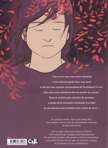 "San et moi nous nous étions demandé si nous devions garder pour nous seuls le fait que nous suivions une procédure de fécondation in vitro. Mais nous avons décidé de tenir les parents au courant. Nous ne voulions plus entendre de remarque à propos de la conception éventuelle d'un bébé et nous pensions que la famille avait le droit de savoir". A travers l'histoire de Bada et San, c'est le récit de vie de nombreux couples qui est raconté : les difficultés physiques et morales, le regard de la famille (et belle-famille), des amis qui, suivant le sexe, reportent leurs propres jugements sur l'un ou l'autre membre du couple, le manque d'empathie du monde médical, les espoirs et déceptions... Et même si la douleur est partagée, c'est bien un sentiment de solitude qui s'empare de la femme. Un drame personnel mais qui véhicule des comportements similaires d'un continent à l'autre. En quelques années, Keum Suk Gendry-Kim s'est imposée comme l'une des dessinatrices les plus importantes en Corée. Ses ouvrages, Mauvaises Herbes et l'Attente, sont couronnés de nombreux prix internationaux. Par ses récits sensibles, elle expose la violence des humains, nous conte l'histoire de son pays, les gens qui y vivent et les séquelles du passé.