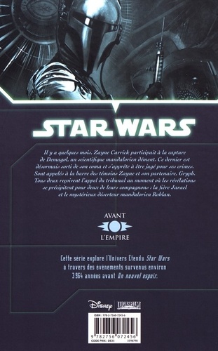 Il y a quelques mois, Zayne Carrick participait à la capture de Demagol, un scientifique Mandalorien fou. Ce dernier est sorti de son coma et s'apprête à être jugé pour ses crimes. Zayne et son partenaire, Gryph, sont appelés à témoigner. Mais des révélations se précipitent concernant leurs compagnons de route : la fière Jarael et le mystérieux déserteur Mandalorien Rohlan.
