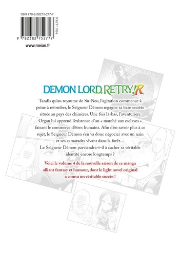 Tandis qu'au royaume de Su-Neo, l'agitation commence à peine à retomber, le Seigneur Démon regagne sa base secrète située au pays des chimères. Une fois là-bas, l'aventurière Organ lui apprend l'existence d'un " marché aux esclaves " faisant le commerce d'êtres humains. Afin d'en savoir plus à ce sujet, le Seigneur Démon s'en va donc négocier avec un nain et ses camarades vivant dans la forêt... Le Seigneur Démon parviendra-t-il à cacher sa véritable identité encore longtemps ? Voici le volume 4 de la nouvelle saison de ce manga alliant fantasy et humour, dont le light novel original a connu un véritable succès !