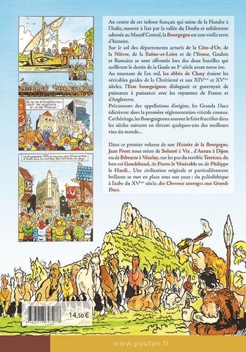 Jean PROST HISTOIRE DE LA BOURGOGNE Première partie : Des Chevaux sauvages aux Grands Ducs Album cartonné de 48 pages en couleurs, format 21 X 30 cm. Prix public : 14, 50 ? Au centre de cet isthme français qui mène de la Flandre à l'Italie, ouverte à l'est par la vallée du Doubs et solidement adossée au Massif Central, la Bourgogne est une vieille terre d'histoire. Sur le sol des départements actuels de la Côte-d'Or, de la Nièvre, de la Saône-et-Loire et de l'Yonne, Gaulois et Romains se sont affrontés lors des deux batailles qui scellèrent le destin de la Gaule au Ier siècle avant notre ère. Au tournant de l'an mil, les abbés de Cluny étaient les véritables guides de la Chrétienté et aux XIVème et XVème siècles, l'Etat bourguignon dialoguait et guerroyait de puissance à puissance avec les royaumes de France et d'Angleterre. Précurseurs des appellations d'origine, les Grands Ducs édictèrent alors la première réglementation viticole connue. Cet héritage, les Bourguignons sauront le faire fructifier dans les siècles suivant en élevant quelques-uns des meilleurs vins du monde... Dans ce premier volume de son Histoire de la Bourgogne, Jean Prost nous mène de Solutré à Vix, d'Autun à Dijon ou de Bibracte à Vézelay ; sur les pas du terrible Tetricus, du bon roi Gondebaud, de Pierre le Vénérable ou de Philippe le Hardi... Une civilisation originale et particulièrement brillante se met en place sous nos yeux : du paléolithique à l'aube du XVème siècle, des Chevaux sauvages aux Grands Ducs.