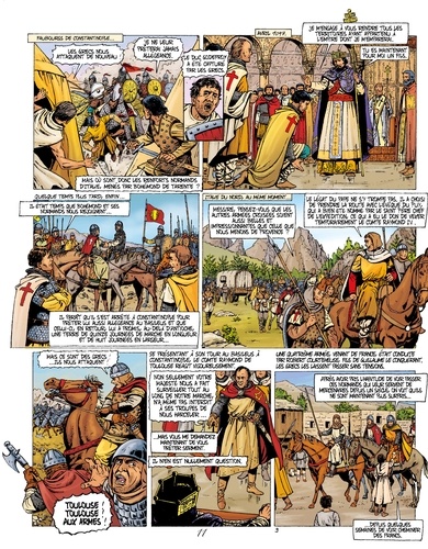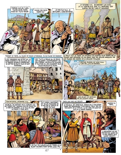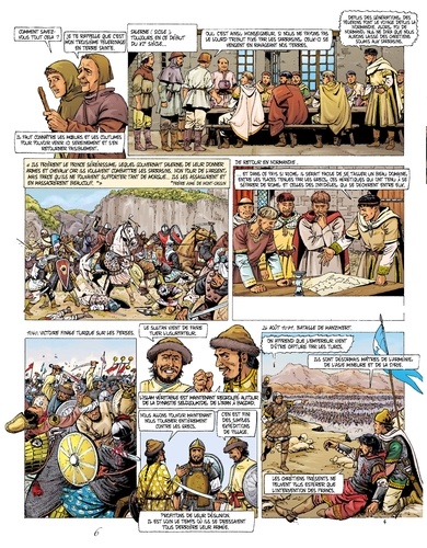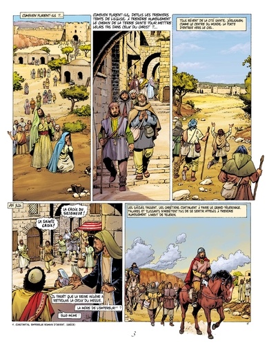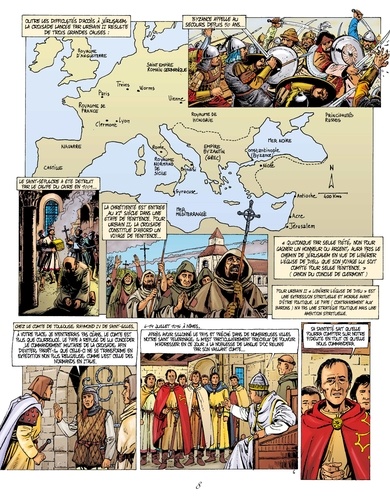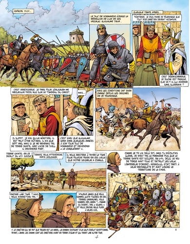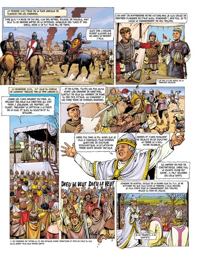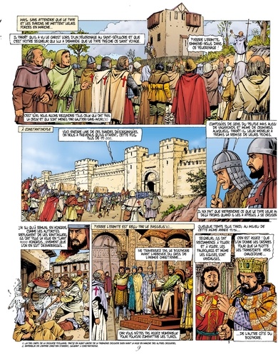 " Combien furent-ils ? Combien furent-ils, depuis les premiers temps de l'église, à prendre humblement le chemin de la Terre sainte pour mettre leurs pas dans ceux du Christ ? " Et qui furent-ils, ces pèlerins à la croix rouge brodée sur leur habit ? Car, au début du XIe siècle, Jérusalem, la cité sainte, est occupée par les Turcs Seldjoukides qui en interdisent l'accès. Le blocage de la situation provoque l'exaspération de la Chrétienté. Et en 1095, Urbain II appelle à la croisade : il encourage à libérer les lieux saints et à porter secours aux chrétiens d'Orient. Le pape lance ainsi un mouvement de deux siècles qui met en marche toute l'Europe sur la route de la " Terre sainte ". Ce rêve du Saint-Sépulcre libéré rejoint les ambitions des souverains occidentaux. La noblesse médiévale retrouve le peuple dans le même pèlerinage armé, au cri de " Dieu le veut ! " De longues colonnes sillonnent l'Europe puis traversent la Méditerranée et les déserts orientaux. Ce sont de pauvres pèlerins sans attaches ou de grands seigneurs, des gueux ou des barons ambitieux. Mais c'est aussi une troupe incontrôlable, en proie à la faim, à la révolte, aux attaques des Turcs et des sarrasins. Car l'épopée qui jette toute l'Europe vers l'Orient est rythmée par le fracas des cimeterres et des épées qui s'entrechoquent. Cette BD entraîne le lecteur des confins de l'Europe jusque sous les murailles imprenables de Jérusalem. C'est une aventure lointaine et pourtant fabuleuse que ces deux premières croisades !