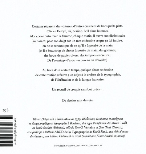 Certains réparent des voitures, d'autres cuisinent de bons petits plats. Olivier Deloye, lui, dessine. Et il aime les mots. Alors pour entretenir la flamme, chaque matin, il ouvre son dictionnaire au hasard, pose son doigt sur un mot et dessine ce que ça lui inspire, en ne se servant que de ce qu'il a à portée de la main (et il a beaucoup de choses à portée de main, des gommes, des bouts de papier divers, des tampons encreurs... De l'avantage d'avoir un bureau en désordre). Au bout d'un certain temps, quelque chose se dessine de cette routine créative ; un objet à la croisée de la typographie, de illustration et de la langue française. Un recueil de croquis sans but précis... De dessins sans dessein.
