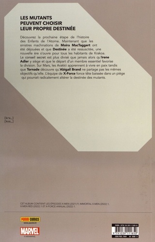 Après les évènements d'INFERNO et X LIVES / X DEATHS OF WOLVERINE, tout ce que les mutants ont bâti sur Krakoa est menacé et la discorde règne. Que ce soit sur Terre ou sur Mars, de terribles secrets vont être dévoilés, certains plus dangereux que d'autres. Quant à Wolverine et X-Force, ils doivent faire face au plan démoniaque d'Orchis ! Une nouvelle ère commence avec de nouvelles séries et des auteurs prestigieux ! Kieron Gillen (Eternals) rejoint Gerry Duggan (X-Men) et Al Ewing (S. H. I. E. L. D.) pour raconter le prochain chapitre de la saga mutante, qui culminera avec l'évènement Judgment Day en 2023 ! Retrouvez donc deux nouveautés : Immortal X-Men et X-Men Red, aux côtés de la série X-Men, ainsi qu'un Annual d'X-Force. Et d'autres surprises sont à venir les prochains mois...