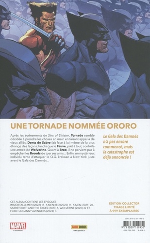 Tornade est confrontée aux conséquences de l'affaire Sins of Sinister, mais que peut-elle faire alors que deux mondes attendent ses décisions et que Charles Xavier lui demande des comptes concernant la mort de Magnéto ? Les Broods massacrent les amis de Broo, quelle sera sa réaction face à sa propre espèce ? Dents de Sabre n'en finit pas d'affronter des doubles de lui-même et le Fauve est prêt à tout pour protéger Krakoa, n'en déplaise à Wolverine et X-Force ! Après les évènements cataclysmiques de Sins of Sinister et pour préparer ceux de Fall of X, courant 2024, les séries en cours trouvent pour la plupart leurs conclusions en novembre. Après X-Terminators et Marauders dans DESTINY OF X 20, c'est au tour d'Immortal X-Men, X-Men Red et Sabretooth and the Exiles de tirer leur révérence (momentanément pour certaines) ! On sait ce que cela signifie : beaucoup de nouveautés en décembre !