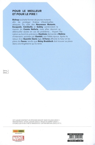 Bishop à l'honneur ! Pour protéger Krakoa, le policier du futur forme une nouvelle génération de X-Men. Mais les dangers n'attendront pas qu'ils aient leur diplôme ! Bienvenue aux nouveaux Nouveaux Mutants : Félina et Karma s'élancent aux côtés de jeunes recrues... puissent-elles survivre à l'expérience ! Captain Britain vit de nouvelles aventures et la nouvelle équipe X-Force doit affronter une menace venue du futur. Encore deux nouvelles séries ce mois-ci : War College donne le beau rôle à Bishop et Lethal Legion propose une nouvelle version des Nouveaux Mutants. Regardez droit devant vous. Ce que vous voyez ? Le gigantesque crossover Fall of X qui arrive courant du premier semestre 2024 !
