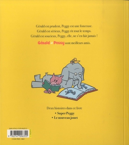 Gérald est prudent, Peggy est une fonceuse. Gérald est sérieux, Peggy rit tout le temps. Gérald est soucieux, Peggy, elle, ne s'en fait jamais ! Gérald et Peggy sont meilleurs amis. Les histoires de Gérald et Peggy sont touchantes et pleines de surprises ! Elles se lisent comme des petits sketches. Elles véhiculent des émotions authentiques et jouent sur tous les ressorts de l'amitié. Quant au dessin incroyablement expressif de Mo Willems, il rend ses personnages extrêmement attachants ! Deux histoires dans ce livre : Super Peggy Gérald est très fort pour lancer les balles... Peggy a envie d'essayer à son tour. Tandis que Gérald met tous ses efforts à lancer loin et fort, Peggy adopte un style... très personnel ! Le nouveau jouet Peggy est impatiente de partager son nouveau jouet avec Gérald. Hélas, Gérald casse le jouet tout neuf... Leur belle amitié va-t-elle se briser, elle aussi ?