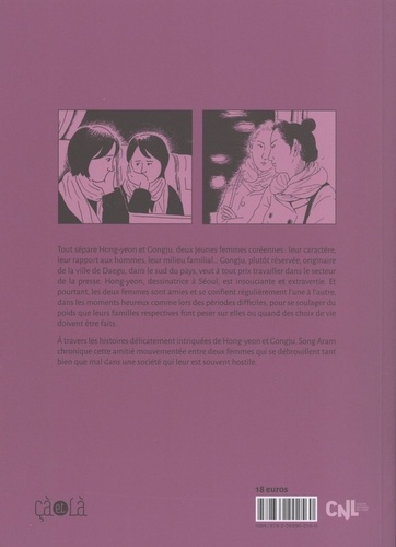 Tout sépare Hong-yeon et Gongju, deux jeunes femmes coréennes : leur caractère, leur rapport aux hommes, leur milieu familial... Gongju, plutôt réservée, originaire de la ville de Daegu, dans le sud du pays, veut à tout prix travailler dans le secteur de la presse. Hong-yeon, dessinatrice à Séoul, est insouciante et extravertie. Et pourtant, les deux femmes sont amies et se confient régulièrement l'une à l'autre, dans les moments heureux comme lors des périodes difficiles, pour se soulager du poids que leurs familles respectives font peser sur elles ou quand des choix de vie doivent être faits. A travers les histoires délicatement intriquées de Hong-yeon et Congju, Song Aram chronique cette amitié mouvementée entre deux femmes qui se débrouillent tant bien que mal dans une société qui leur est souvent hostile.