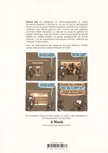 Fabrice Erre est enseignant en histoire-géographie et auteur de bande dessinée. Il raconte ici, au jour le jour, le déroulement de son année au lycée, théâtre d'épiques combats pour maintenir l'attention des élèves jusqu'au bac, comme de leur expliquer comment utiliser Wikipédia, ou discuter du swag du général de Gaulle. Il témoigne aussi de la façon dont l'école reçoit les grands débats de société (théorie du genre, enseignement du roman national...) et les événements dramatiques comme l'attentat qui a frappé Chante hebdo.
