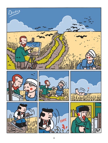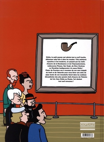 Vous ne pourrez plus le voir en peinture !!! Tout le monde connait Dickie, le petit paysan qui sabote tout ce qu'il touche. Eh bien celui qui s'en est déjà pris à la grande Histoire, au cinéma, aux contes de fées et à la science-fiction, débarque cette fois-ci dans les musées ! Des peintures rupestresà l'art moderne, en passant par les chefs-d'oeuvre de la Renaissance et de l'Impressionnisme, redécouvrez Picasso, Van Gogh, de Vinci, Hockney ou Mondrian revisités à la sauce Dickie ! Pieter de Poortere use à nouveau de son sens inégalé du trash et de l'absurde pour nous livrer une série de gags muets de son moustachu favori dans les coulisses désopilantes des plus grands chefs-d'oeuvre de l'histoire de l'art. Avec Dickie au musée, l'art devient tout sauf ennuyeux !