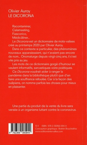 Racontaminer, Calameeting, Fiascorico, Médicâliner... Le Dicorona est un dictionnaire de mots-valises créé au printemps 2020 par Olivier Auroy. Dans ce contexte si particulier, des phénomènes nouveaux apparaissaient, qui n'avaient pas encore de nom... Onomaturge depuis vingt-cinq ans, il s'est vite pris au jeu. Les mots de ce dictionnaire gorgé d'humour se veulent informatifs, sarcastiques voire poétiques. Ce Dicorona voudrait aider à ranger la pandémie dans la bibliothèque plutôt que d'en faire une souffrance refoulée. Car à la façon des oulipiens, on nomme parfois les choses pour mieux en plaisanter. Une partie du produit de la vente du livre sera versée à un organisme luttant contre le coronavirus.