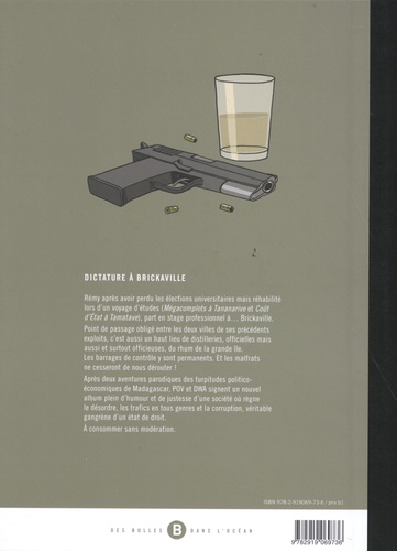 Rémy, après avoir perdu les élections universitaires mais réhabilité lors d'un voyage d'études (Méga complots à Tananarive et Coût d'Etat à Tamatave), part en stage professionnel à... Brickaville. Point de passage obligé entre les deux villes de ses précédents exploits, c'est aussi un haut lieu de distilleries, officielles mais aussi et surtout officieuses, du rhum de la grande île. Les barrages de contrôle y sont permanents, et les malfrats pas toujours du côté des contrôlés ! Après deux aventures parodiques des turpitudes politico-économiques de Madagascar, POV et DWA signent un nouvel album plein d'humour et de justesse d'une société où règne le désordre, les trafics en tous genres et la corruption, véritable gangrène d'un état de droit. A consommer sans modération !