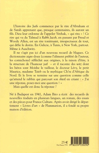 Ce livre n'est pas un livre très orthodoxe... L'histoire mythique du peuple juif commence par le rire, celui d'Abraham et de Sarah apprenant que, presque centenaires, ils auront un fils. Et ce n'est pas tout : Dieu ordonne aux futurs parents d'appeler ce fils Isaac, Yitzhak, " qui rira " ! Ce rire juif, qui va du Talmud à Tristan Bernard, à Sholem Aleichem, à Pierre Dac, à Woody Allen, à Romain Gary, à Georges Perec, à Philip Roth, à Rabbi Jacob ou à La Vérité si je mens , en passant par Bergson, Freud et Groucho Marx, est un rire ouvert, tonitruant, irrespectueux de tout, qui défie le destin. En Galicie, à Tunis, à New York, partout. Même à Auschwitz. Dans une baraque, quelques juifs prient. Un d'eux, oubliant où il se trouve, lève la voix. Les autres le rappellent à l'ordre. "Tais-toi donc ! Dieu pourrait t'entendre et se rendre compte qu'il ''en '' reste encore ! " Il ne s'agit pas ici d'un nouveau recueil de blagues, de witz juifs. Dans ce dictionnaire aigre-doux (comme l'aliment préféré de l'auteur, les cornichons), Adam Biro, en consacrant des articles à la " Bible ", au " Chemin ", aux " Femmes ", à la " Modestie " ou à la " Vérité ", réfléchit au principe même de l'humour juif, partie intégrante du judaïsme. A ses origines, à sa raison d'être, à sa structure et à son rôle - ; tout en racontant des witz dont les héros immortels sont Moïshe le tailleur, le docteur Lévy, le petit Maurice, madame Taïeb ou le mythique Ch'ra d'Afrique du Nord. Et le livre se termine sur une question comme celle qu'attend le rabbin qui parcourt son shtetl en criant : " J'ai une réponse, posez-moi une question ! " Mais quelle est donc La réponse ?